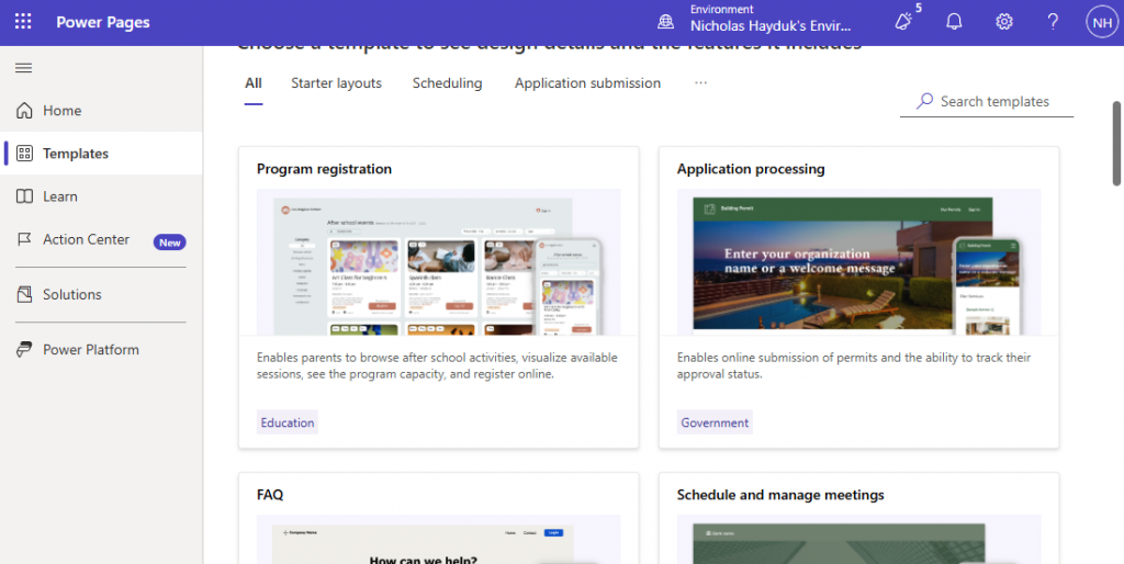 When I refer to templates in this post, I’m talking about the templates available to choose from when a user first installs a Power Pages site. These templates provide prebuilt functionality that act as a starting point from where you can create your own customized site.